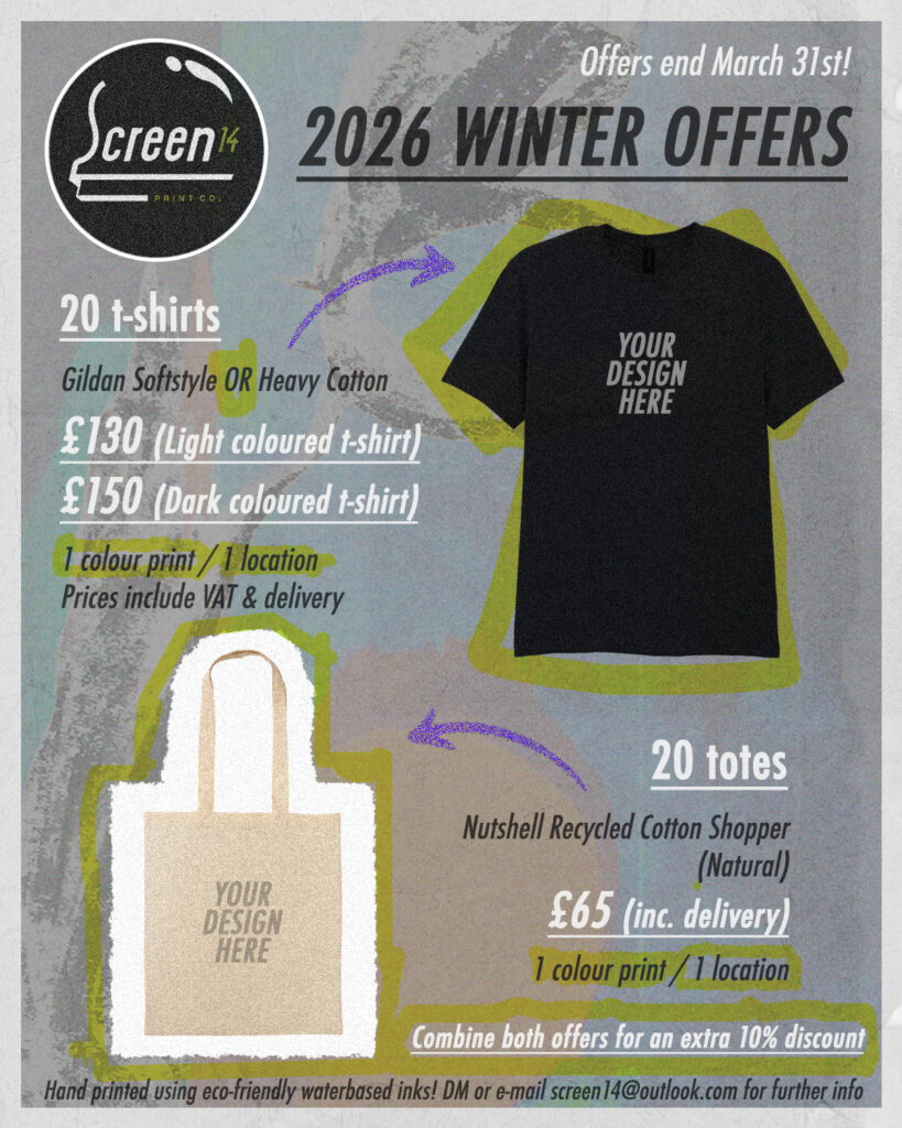 If you are unfamiliar with the art of screen printing please have a browse through the PRICING, FAQs & PORTFOLIO sections of the website to help answer some questions you may initially have.
